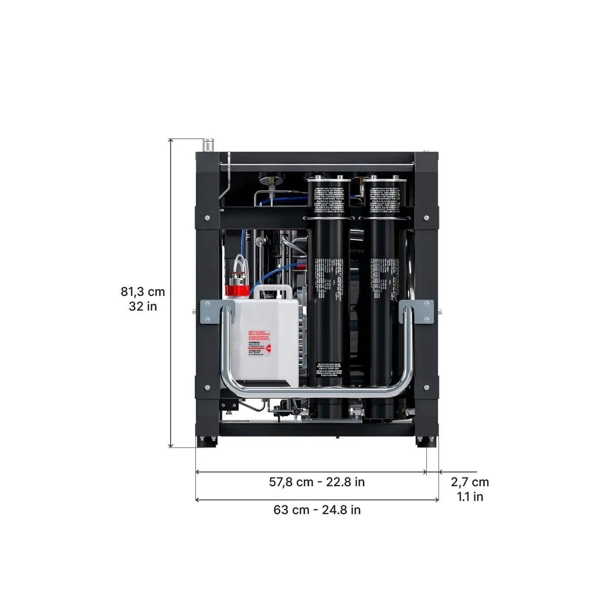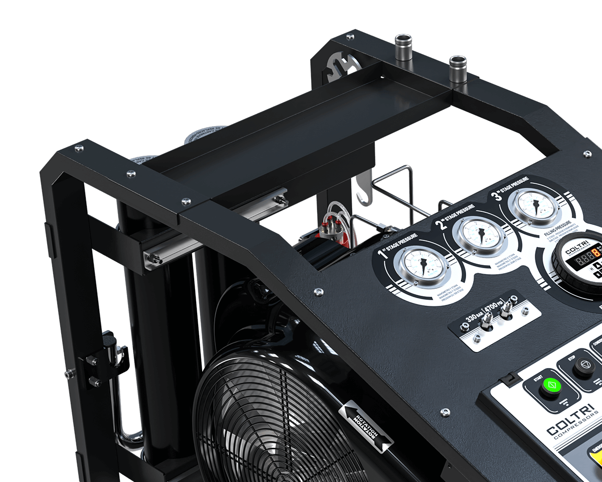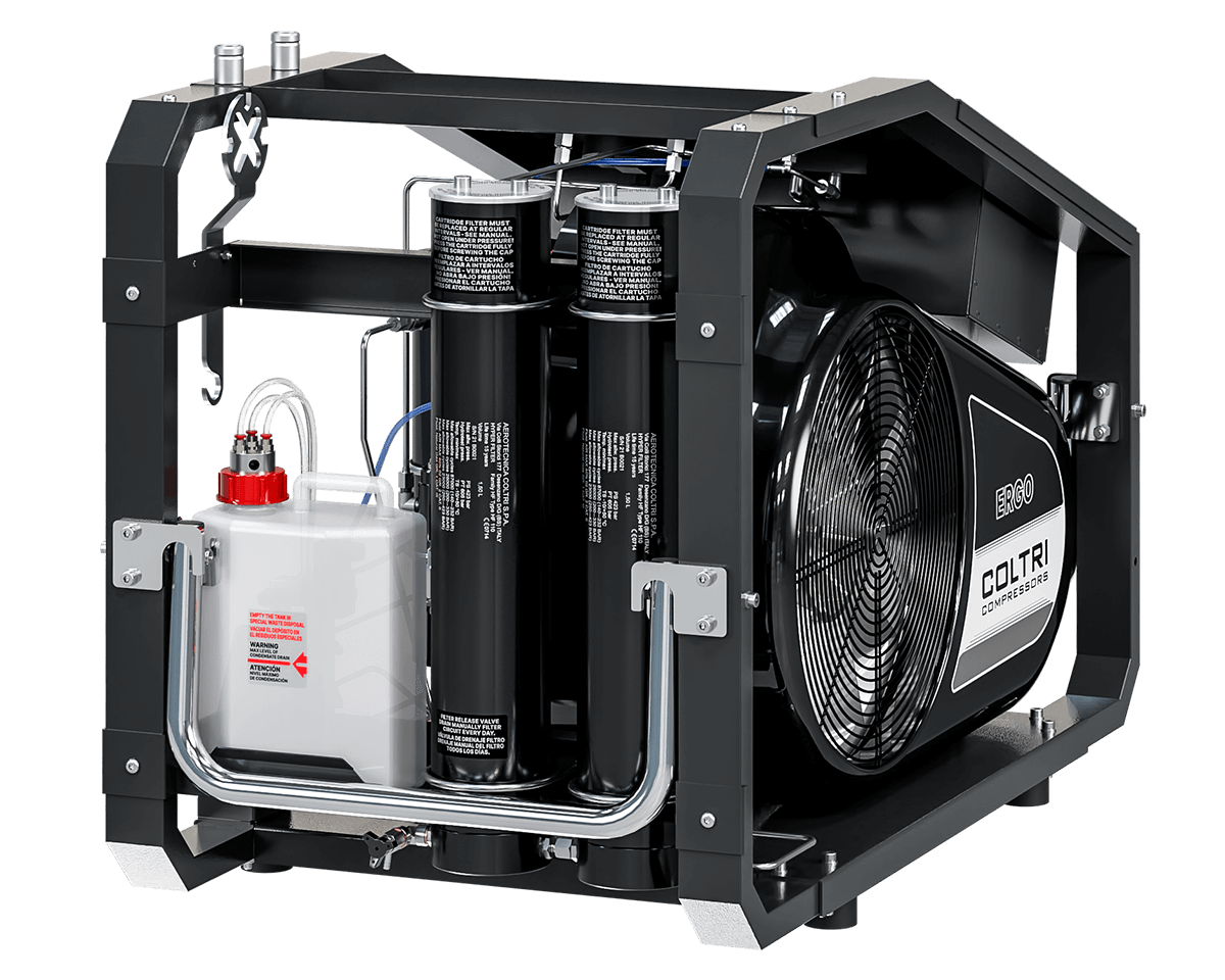 Он оснащен панелью с системой контроля, включающей манометры, автостоп с регулируемым электронным реле давления, автоматический слив конденсата и контроль направления вращения. Он также оснащен двумя соединениями для шлангов высокого давления и системой фильтров увеличенного размера с двумя Hyperfilter. В качестве опции может быть добавлена выносная зарядная панель.